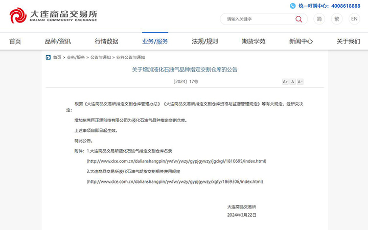 3月22月,大連商品交易所官網(wǎng)發(fā)布公告,增加東莞巨正源科技有限公司為液化石油氣品種指定交割倉庫,標準倉單最大量為90000噸,是該品種華南地區(qū)最大的基準庫,日發(fā)貨速度可達6000噸/天。