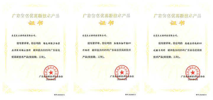 近日,廣東省高新技術(shù)企業(yè)協(xié)會(huì)公布了2025年第一批廣東省名優(yōu)高新技術(shù)產(chǎn)品名單。東莞巨正源科技有限公司的“綠色環(huán)保多場(chǎng)景應(yīng)用聚丙烯注塑料”、“紡能恒韌中熔PP纖維料”、“高透潔凈低析PP吹膜專用料”三項(xiàng)產(chǎn)品憑借卓越的產(chǎn)品品質(zhì)、創(chuàng)新的產(chǎn)品技術(shù)和領(lǐng)先的市場(chǎng)地位,榮獲“廣東省名優(yōu)高新技術(shù)產(chǎn)品”稱號(hào)。
