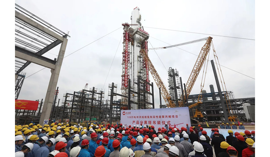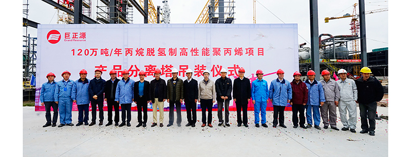 12月12日上午,巨正源公司120萬噸/年丙烷脫氫制高性能聚丙烯項目(以下簡稱“丙烷脫氫項目”)產(chǎn)品分離塔吊裝儀式在東莞市沙田鎮(zhèn)立沙島舉行。最大直徑12米、高128米,總重量約3050噸的“巨無霸”——產(chǎn)品分離塔整體一次成功吊裝就位,創(chuàng)造了國內(nèi)乃至亞洲大型設(shè)備吊裝新紀(jì)錄,同時也標(biāo)志著丙烷脫氫項目第一階段工程建設(shè)全面進入沖刺階段。
