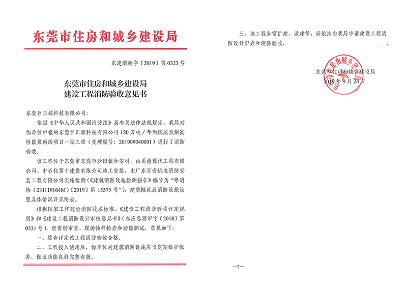 近日,巨正源科技公司120萬(wàn)噸/年丙烷脫氫制高性能聚丙烯項(xiàng)目一期工程順利通過(guò)東莞市住房和城鄉(xiāng)建設(shè)局的消防驗(yàn)收,為該項(xiàng)目全線投產(chǎn)提供了堅(jiān)實(shí)的安全保障。