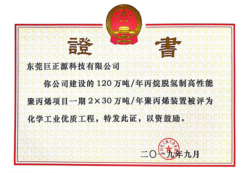 近日,中國化工施工企業(yè)協(xié)會(huì)公布全面提升工程質(zhì)量創(chuàng)建優(yōu)質(zhì)精品工程活動(dòng)成果。巨正源公司投資建設(shè)的“120萬噸/年丙烷脫氫制高性能聚丙烯項(xiàng)目”一期2×30萬噸/年聚丙烯裝置獲評(píng)全國“化學(xué)工業(yè)優(yōu)質(zhì)工程”。