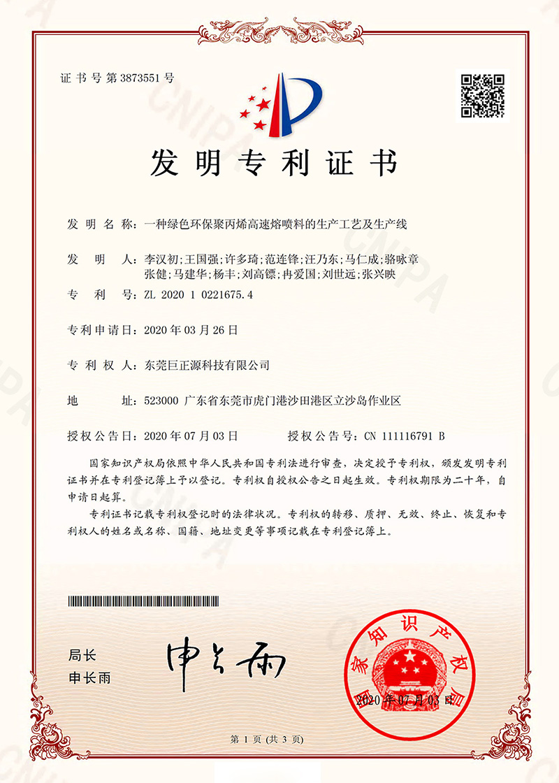 近日,由巨正源科技公司自主研發(fā)的“一種綠色環(huán)保聚丙烯高速熔噴料的生產(chǎn)工藝及生產(chǎn)線”獲得國(guó)家知識(shí)產(chǎn)權(quán)局授予發(fā)明專利證書(專利號(hào):ZL202010221675.4)。這也是巨正源科技公司獲得的首個(gè)發(fā)明專利。