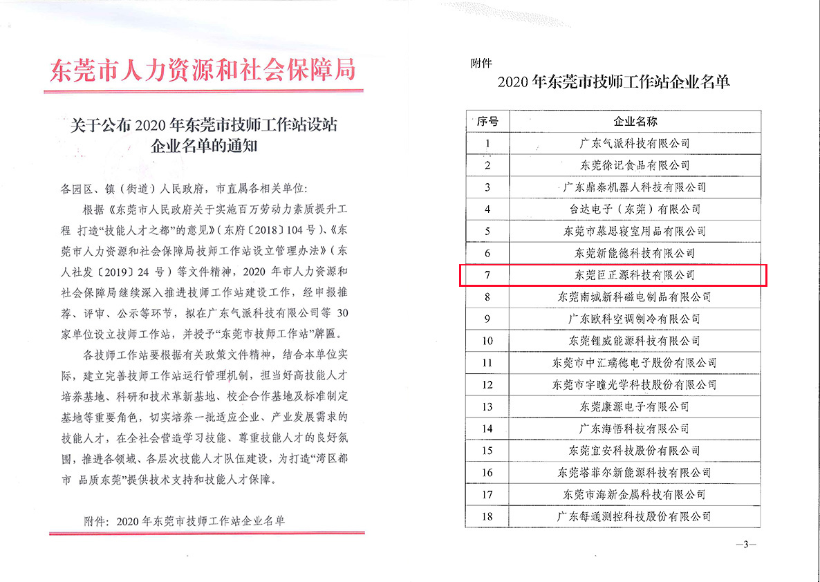 11月9日,東莞市人力資源和社會(huì)保障局公布2020年?yáng)|莞市技師工作站設(shè)站企業(yè)名單。經(jīng)過(guò)申報(bào)推薦、專家評(píng)審、資格審查、社會(huì)公示,東莞巨正源科技有限公司成功獲批設(shè)立“東莞市技師工作站”。