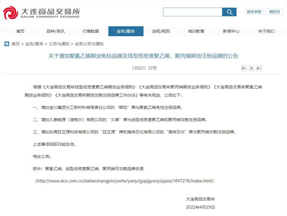 4月29日,大連商品交易所官網(wǎng)發(fā)布公告,增加東莞巨正源科技有限公司的“巨正源”牌聚丙烯為聚丙烯期貨交割注冊品牌。