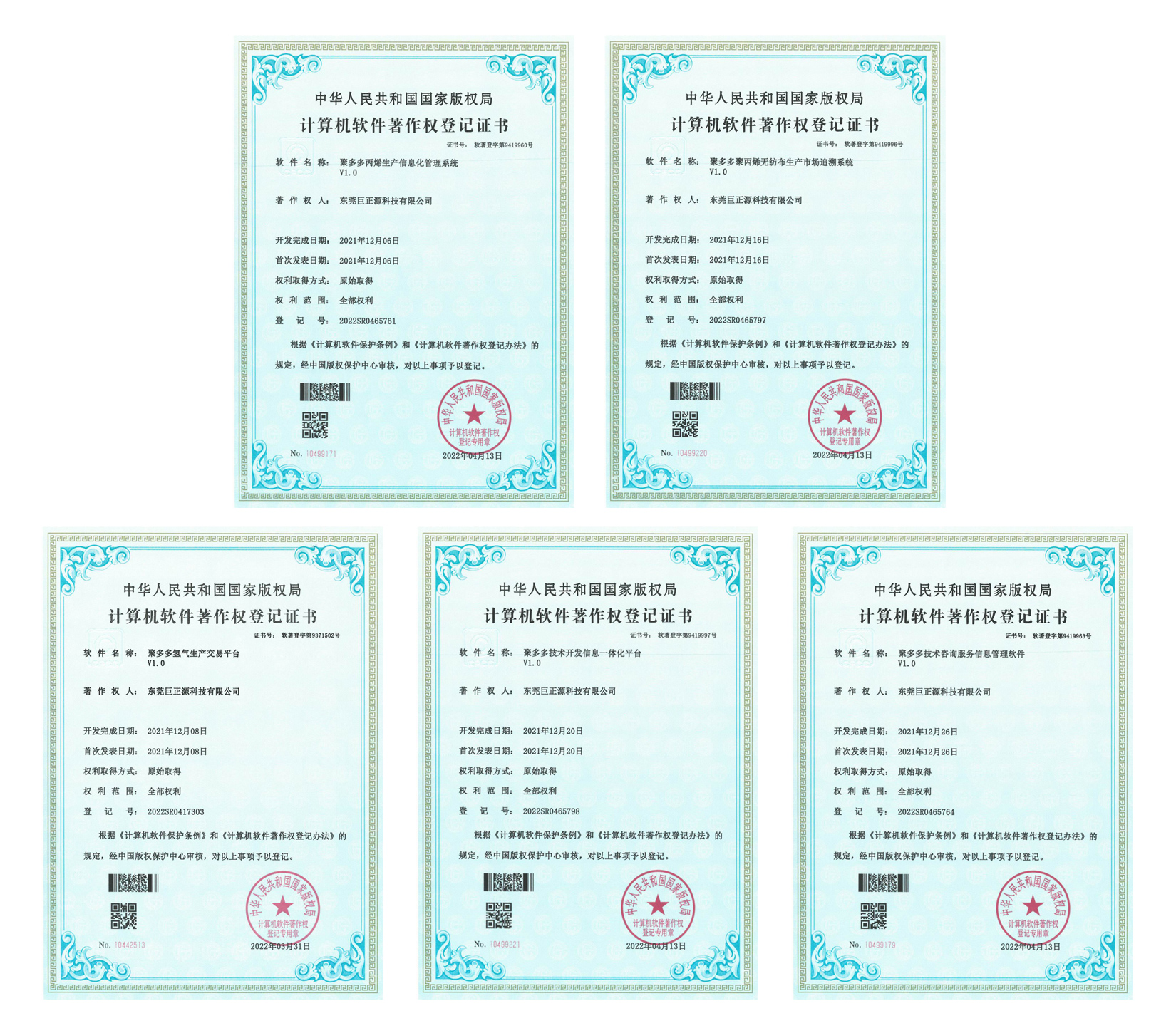 此次獲得軟件著作權(quán)證書包括:《聚多多氫氣生產(chǎn)交易平臺V1.0》、《聚多多丙烯生產(chǎn)信息化管理系統(tǒng)V1.0》、《聚多多技術(shù)咨詢服務(wù)信息管理軟件V1.0》、《聚多多聚丙烯無紡布生產(chǎn)市場追溯系統(tǒng)V1.0》、《聚多多技術(shù)開發(fā)信息一體化平臺V1.0》。這些都是巨正源公司圍繞以“技術(shù)創(chuàng)新”和“產(chǎn)品研發(fā)”通過自主研發(fā)推進自動化生產(chǎn)、智能化管理所取得的知識產(chǎn)權(quán)成果,并全部應(yīng)用于公司生產(chǎn)信息系統(tǒng)中,為聚多多電商平臺技術(shù)開發(fā)、服務(wù)管理、實現(xiàn)創(chuàng)新平臺線上銷售模式提供信息化數(shù)字基礎(chǔ)。
