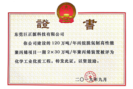 近日,中國(guó)化工施工企業(yè)協(xié)會(huì)公布全面提升工程質(zhì)量創(chuàng)建優(yōu)質(zhì)精品工程活動(dòng)成果。巨正源公司投資建設(shè)的“120萬噸/年丙烷脫氫制高性能聚丙烯項(xiàng)目”一期2×30萬噸/年聚丙烯裝置獲評(píng)全國(guó)“化學(xué)工業(yè)優(yōu)質(zhì)工程”。